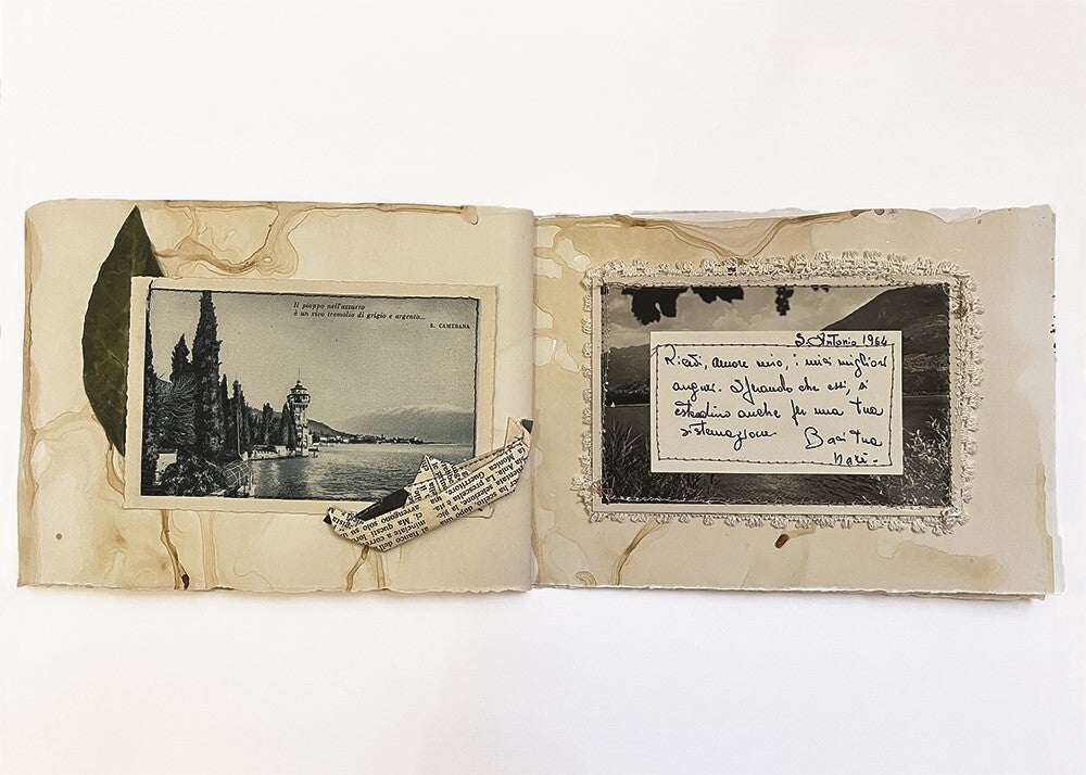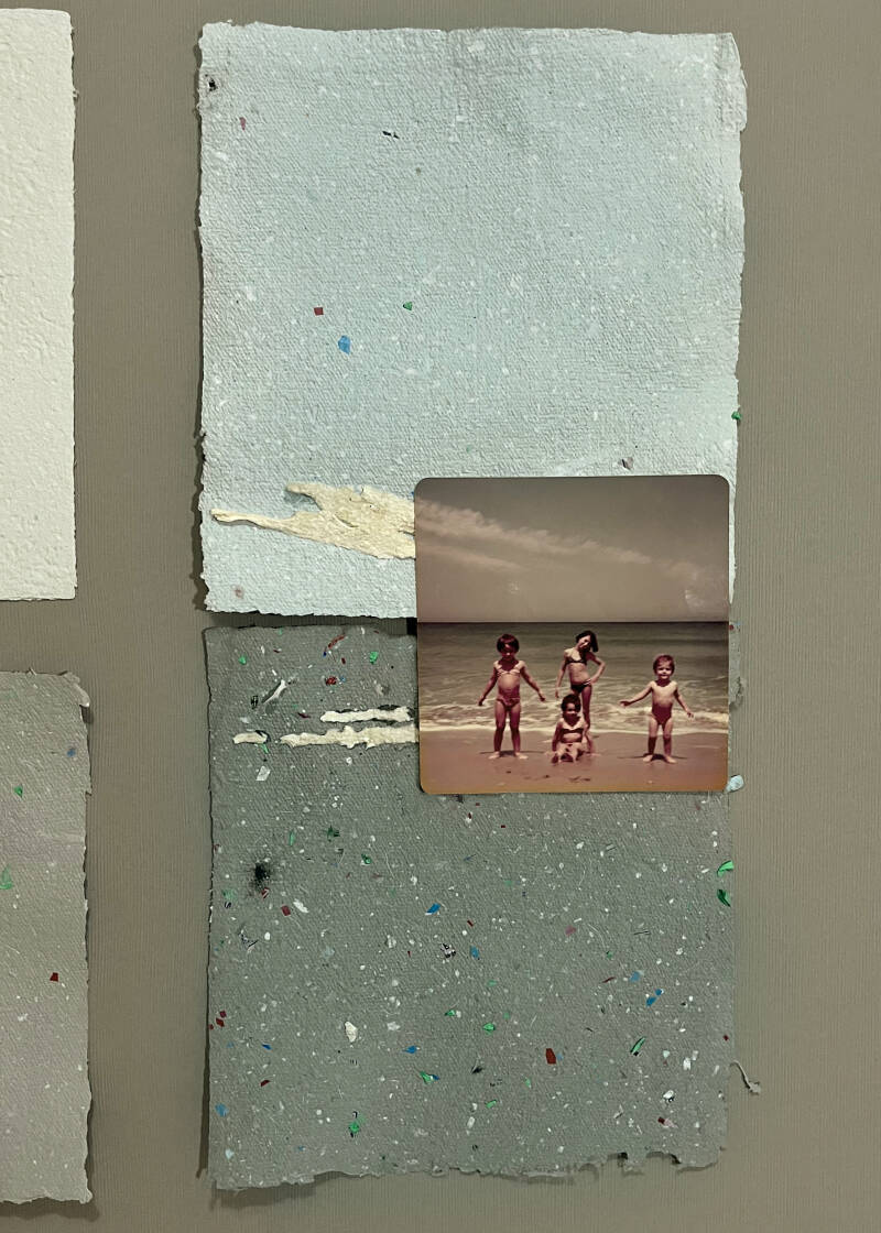 tecnica mista, collage fotografico, con carta realizzata a mano (tragitto e raccolta dei rifiuti ambientali, scarti, sabbia, acqua marina, microplastiche, carta e frammenti di tessuti), 2022